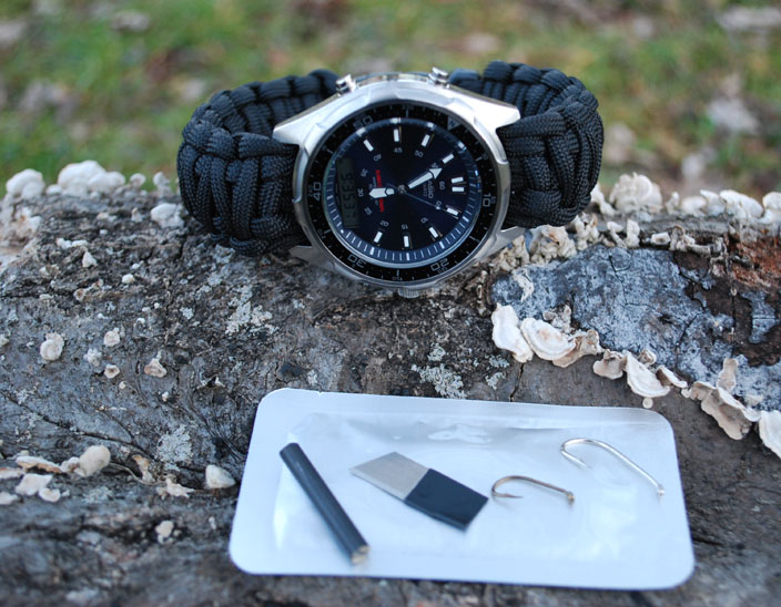 The Real Survival Watch band: Real 550 Paracord watchband with a survival kit hidden inside: --------------------------- Inside the band: - 1 Blade w/h handle - 2 Fishing hooks - 1" Firesteel rod - Fire starting twine